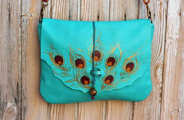 This unique turquoise shoulder bag with peacock feather design is completely handmade with the best quality Spanish cowhide leather. It is very light and soft and smooth to the touch.