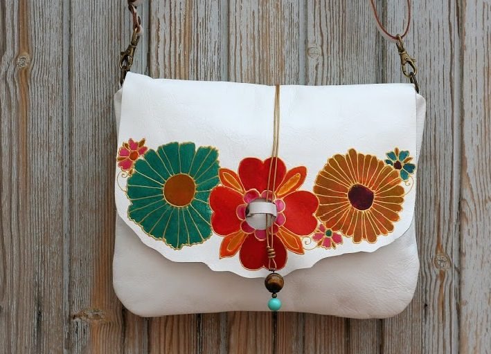 White leather bag painted with flowers