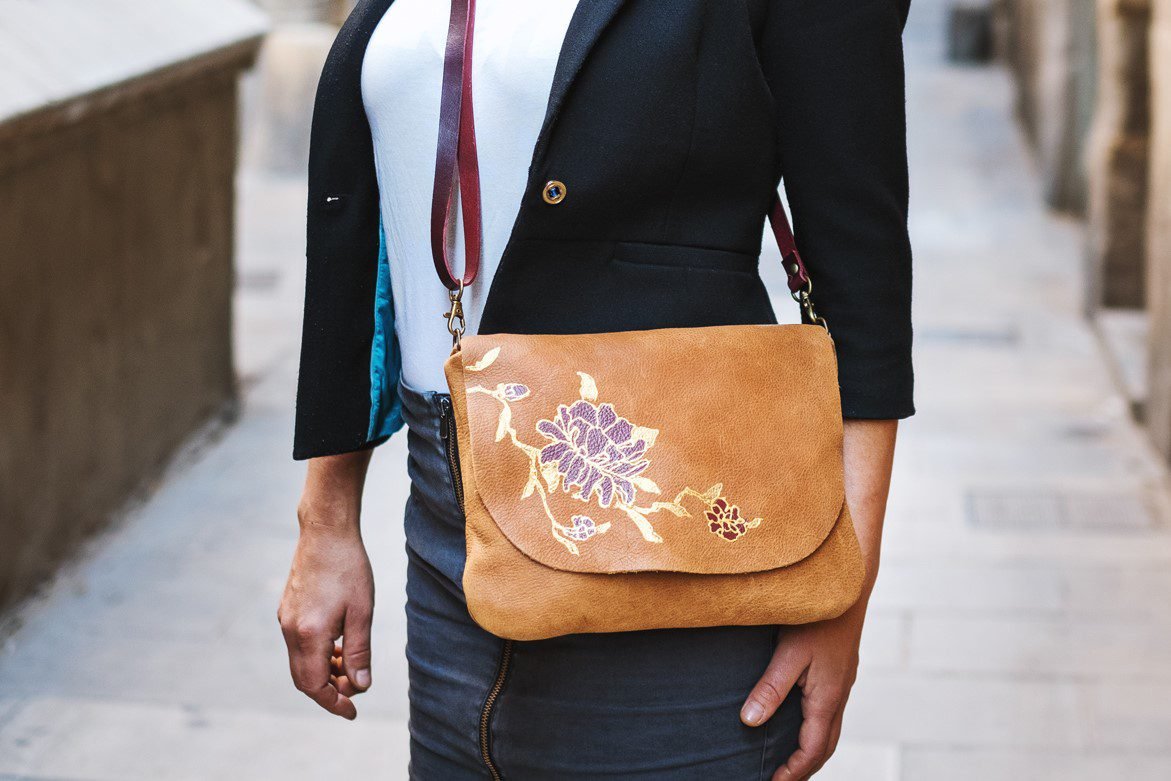 Bolsa de piel de color marrón claro con flores pintadas