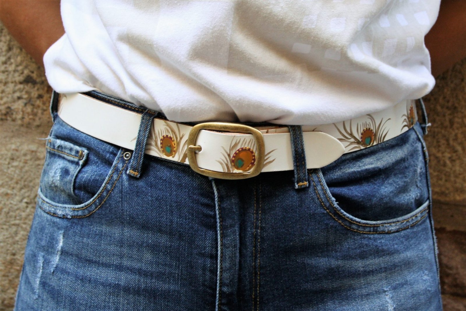 Cinturón de cuero blanco para mujer con un diseño de plumas de pavo real y un toque dorado. En Rossymina, hacemos los cinturones de cuero a mano con la mejor calidad de piel de vaca española.
