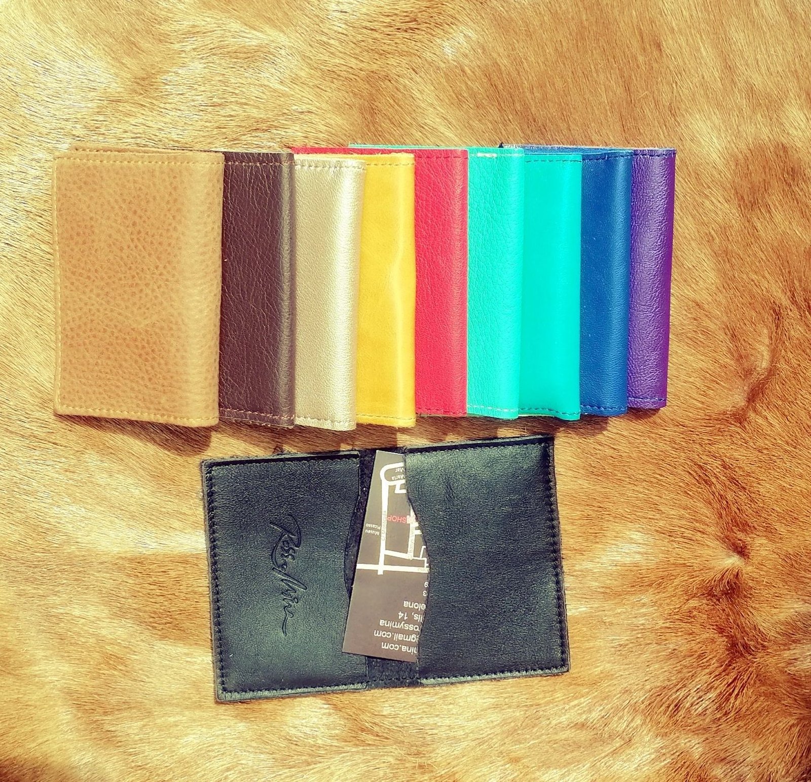 Porta-targetes amb dues ranures que s’obre com un llibre en diferents colors de pell. Capacitat per a targetes de visita i de crèdit, així com bitllets plegats.